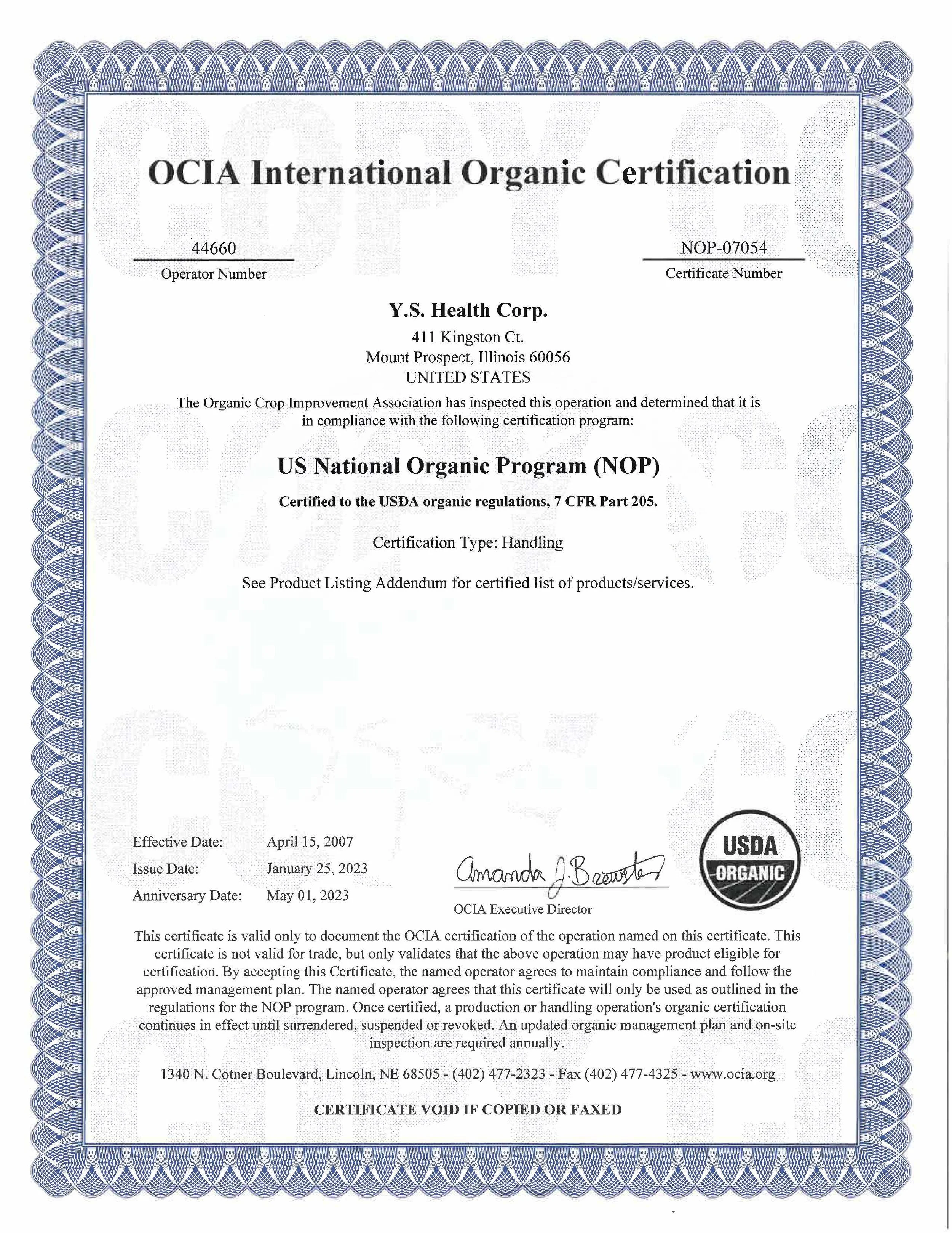 Organic means that all ingredients are grown using only natural substances without the use of any synthetic chemicals, such as fertilizers, pesticides, fungicides, herbicides, or growth hormones. Facilities and food products with the USDA Organic Certification label undergo intensive screening by the USDA in order to meet the standards of certified organic.